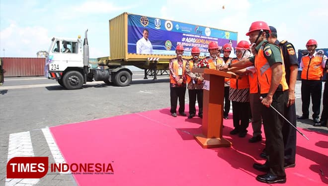 TIMES Biak/Gubernur Jawa Timur. Dra. Hj. Khofifah Indar Parawansa saat melepas ekspor komoditi pertanian di Terminal PetikEmas Surabaya (TPS). Kamis (21/3/2019). (FOTO: TIM Media For TIMES Indonesia)